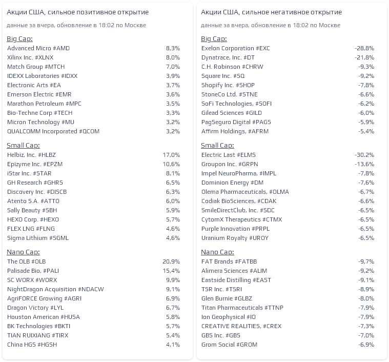 Первый список - сильное позитивное (+) открытие (то есть акции, которые сильно выросли в первые 30 минут торгов). Второй список - сильное негативное (-) открытие (то есть акции, которые сильно просели в первые 30 минут торгов):