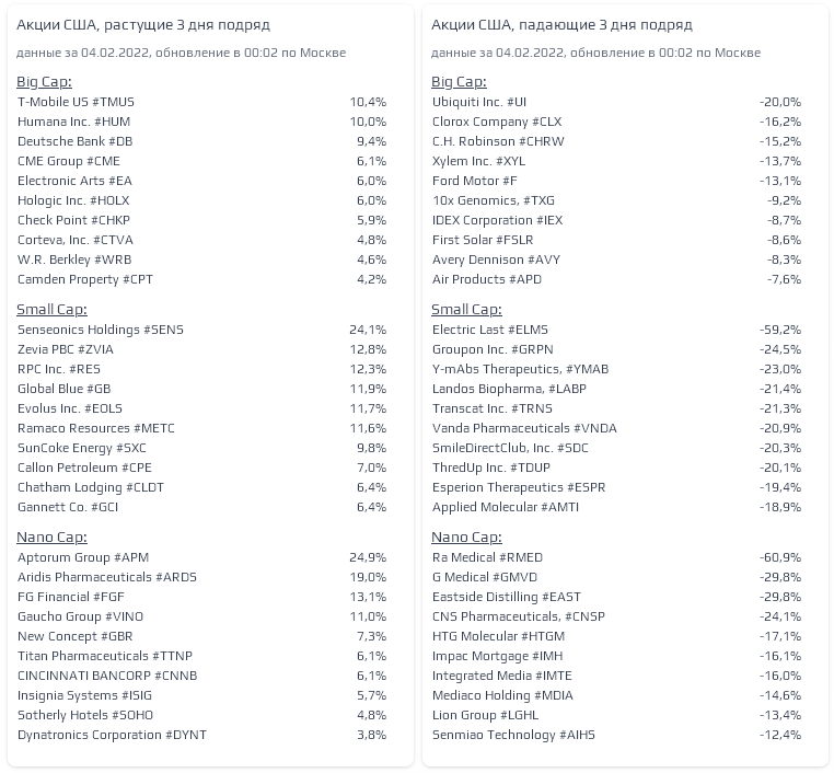 Чем меньше капитализация (cap), тем сильнее динамика акции внутри дня или на треке в несколько дней или месяцев. Эти списки помогают торговать импульсные среднесрочные стратегии и видеть, в каких акциях назревает либо заканчивается среднесрочный, а, возможно, и долгосрочный тренд. Увидеть зарождающийся или новый импульс, взглянуть на график и фундаментальные показатели - принять решение: купить / добавить акцию (в спекулятивный среднесрочный или долгосрочный портфель) или избавиться от нее на какое-то время.