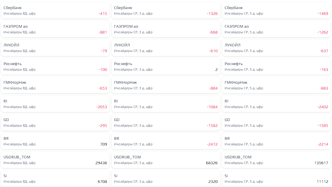 - Интерес инсайдеров, цифровой, среднесрочный (за 5 дней (помогает понять темп изменения настроений и направление интереса инсайдеров за последние 5 дней);
