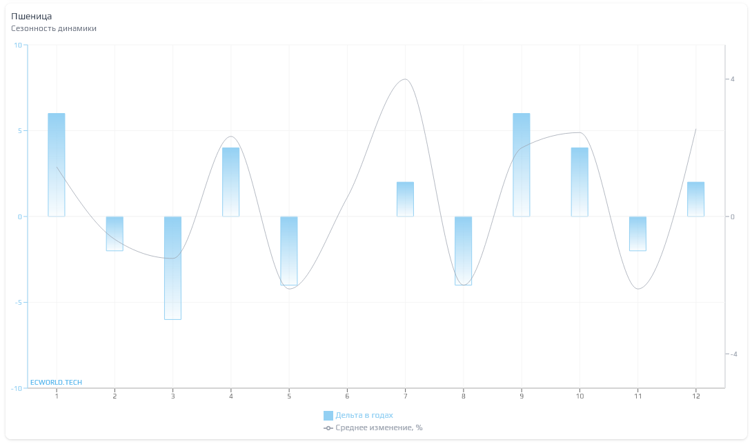 Ниже на графике можно увидеть сезонность для тикера (финансового инструмента, товар) Пшеница: