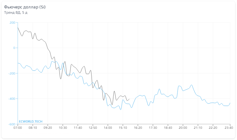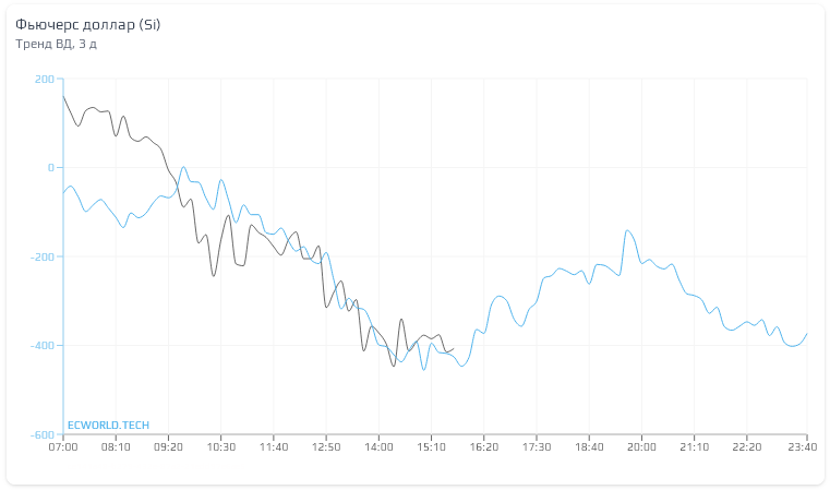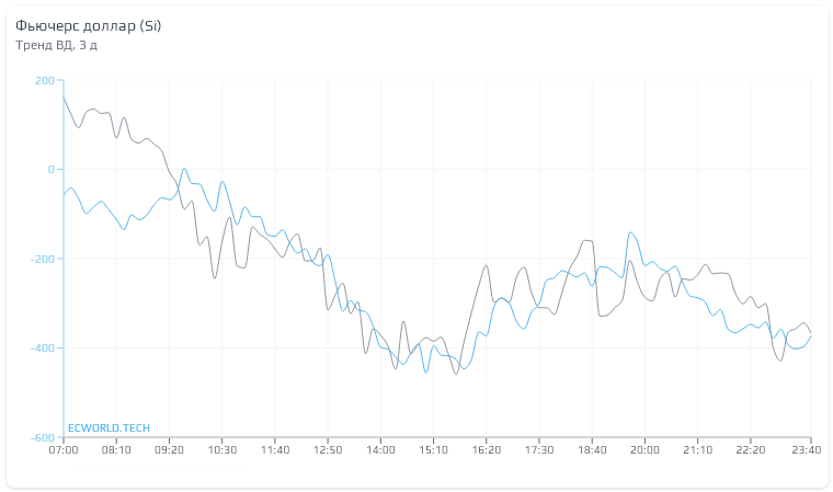 На втором графике мы видим, как цена сегодняшнего дня (серая линия) практически повторяет тренд последних 5 дней (голубая линия) фьючерса на доллар (Si):